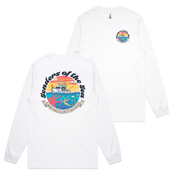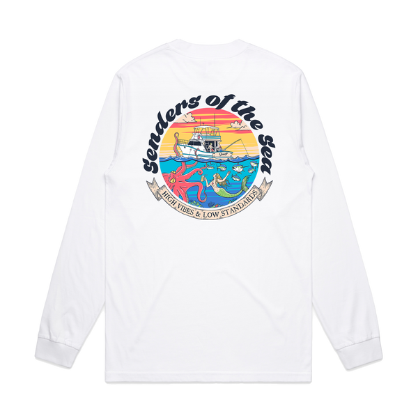 Get hooked on the Senders of the Sea Long Sleeve – the ultimate shirt for those who embrace the salty lifestyle, good vibes, and the thrill of fishing! 🌊🎣